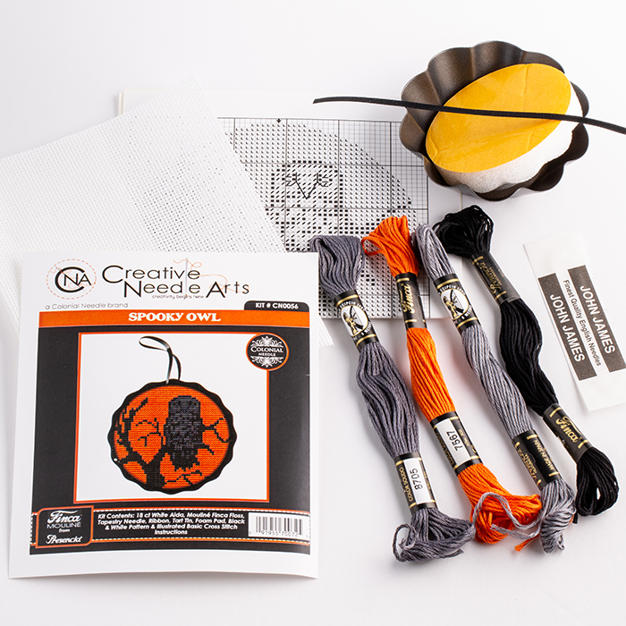 Kit Includes: 18ct White Aida Cloth, Presencia Floss, Tapestry Needle, Ribbon, Tart Tin, Foam Pad, Black & White Pattern, and Illustrated Basic Cross Stitch Instructions
