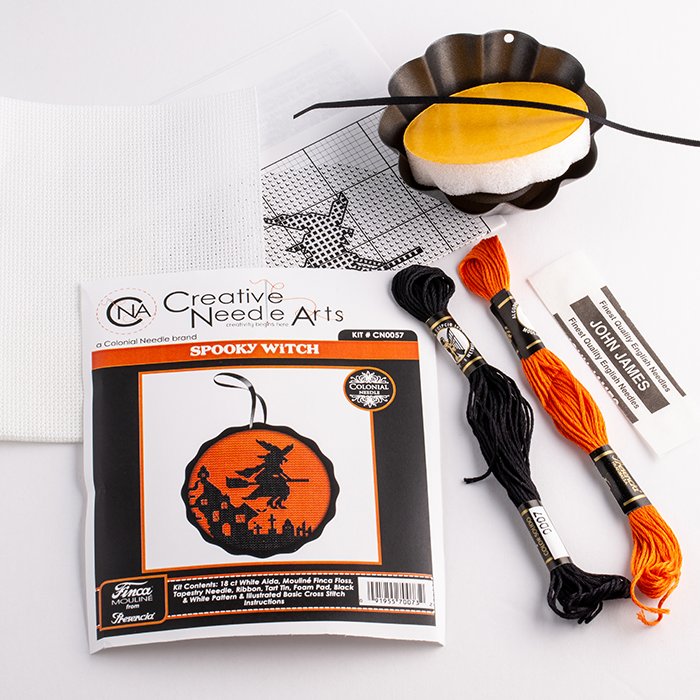 Kit Includes: 18ct White Aida Cloth, Presencia Floss, Tapestry Needle, Ribbon, Tart Tin, Foam Pad, Black & White Pattern, and Illustrated Basic Cross Stitch Instructions