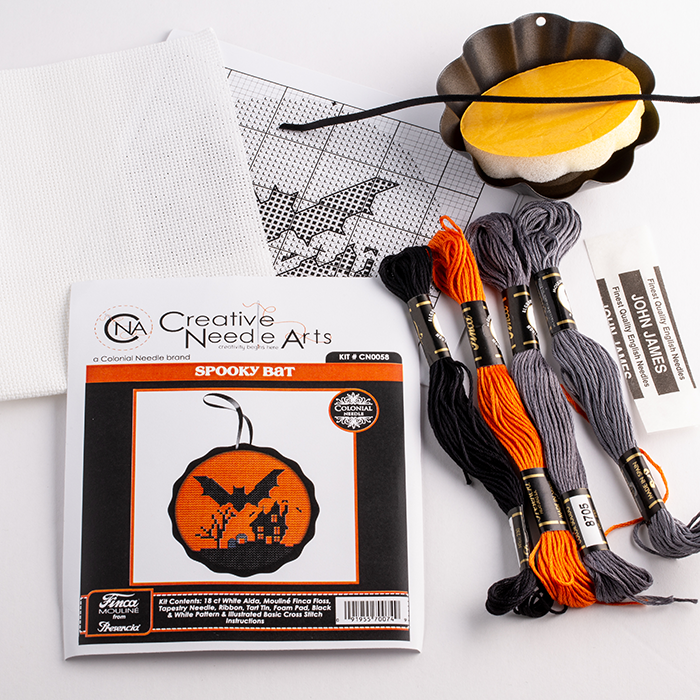 Kit Includes: 18ct White Aida Cloth, Presencia Floss, Tapestry Needle, Ribbon, Tart Tin, Foam Pad, Black & White Pattern, and Illustrated Basic Cross Stitch Instructions